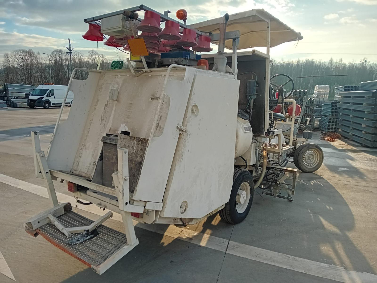 | Hydraulic drive, swivel paint tank 385 l, glass bead tank 2x112 l, cleaning fluid container 20 l, compressor 2160 l/min , Malcon 2/ELC2, sunshade, rear platform, tiltable warning arrow in the back, warning light array in front, set of working lights, rolling disc marking unit, dust blower etc. |